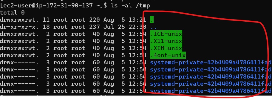 drwxrwxrwt. 2 root root 40 Aug 5 12:54 ESC[30;42m.XIM-unixESC[0m
